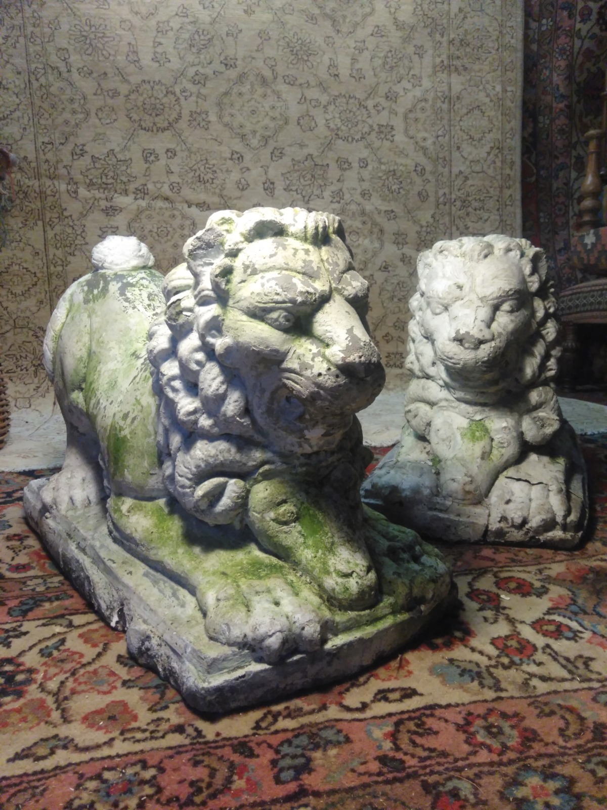 Large Pair of Early 20th Century Stone Lions with Ram Great Patina and Layers of Old Paint