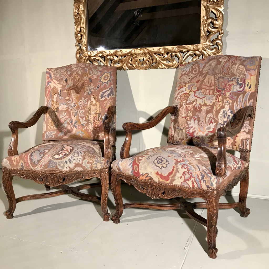 Large Pair of French 19th Century High Back Tapestry Armchairs