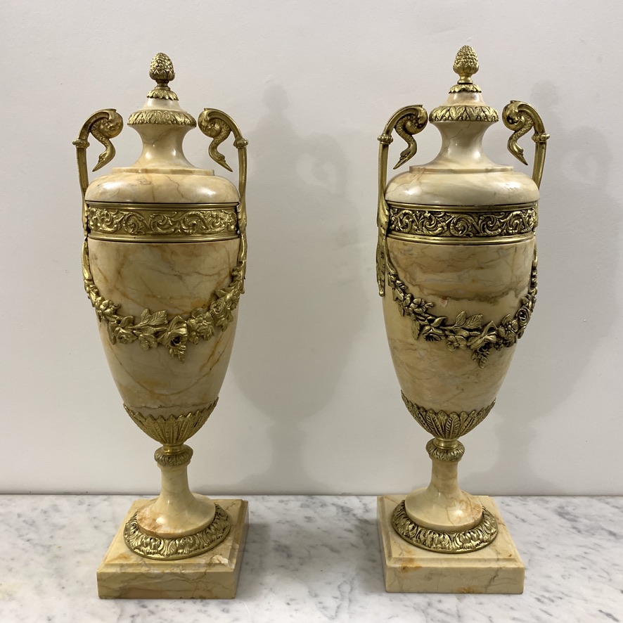 Large Pair of French Siena Marble Cassolettes with Brass Mounts