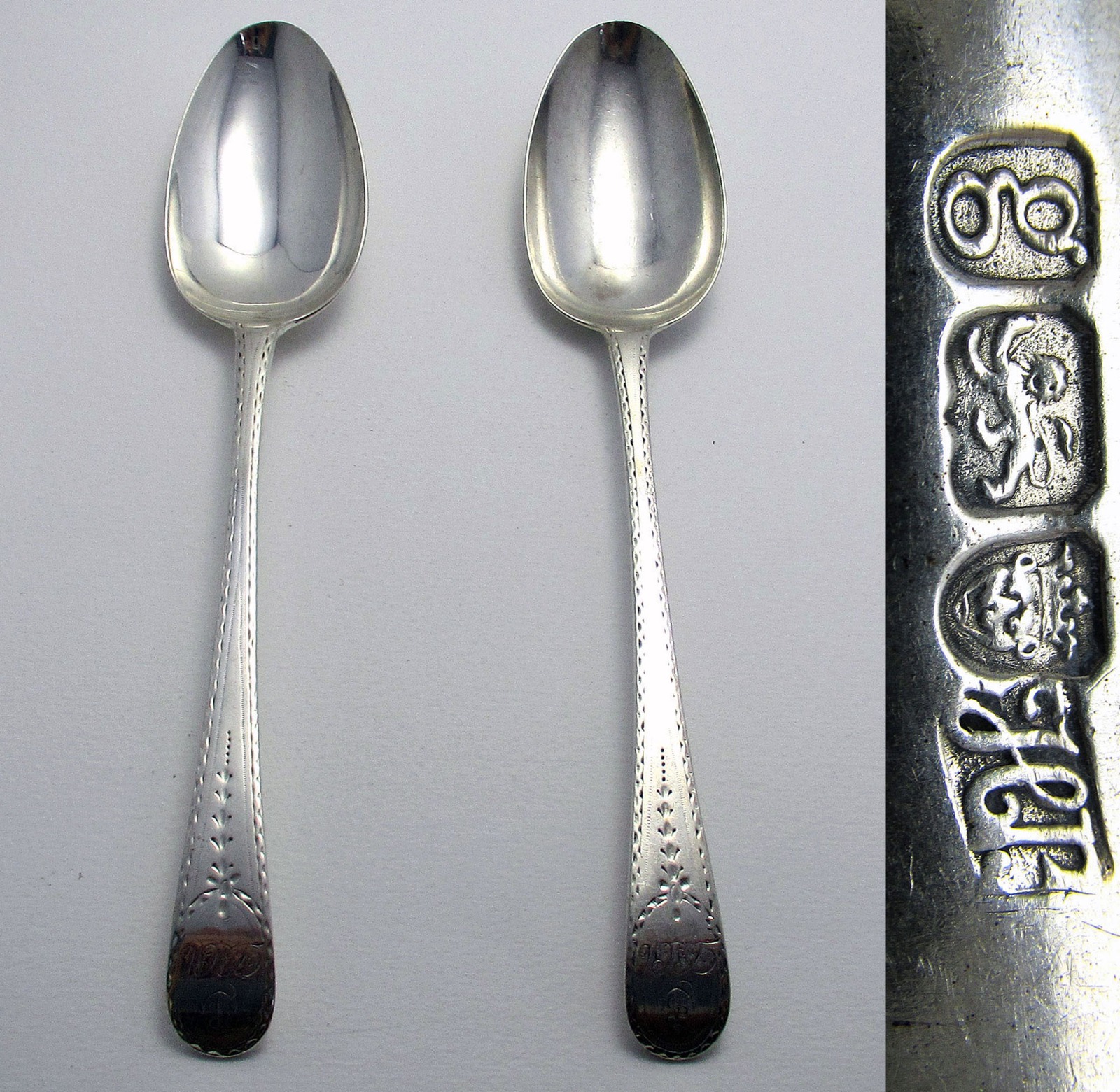 Large Pair of Hester Bateman George III Solid Sterling Silver Bright-Cut Antique Table Serving Spoons