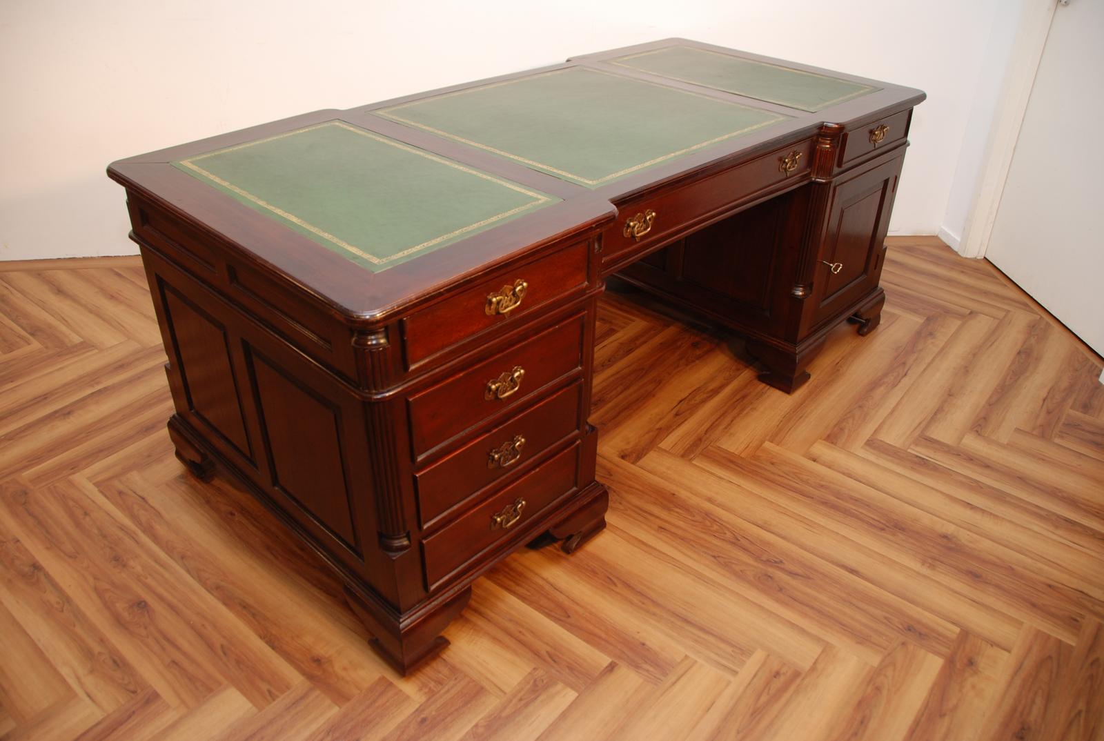 Large Partners Twin Pedestal Green Leather Top Writing Desk