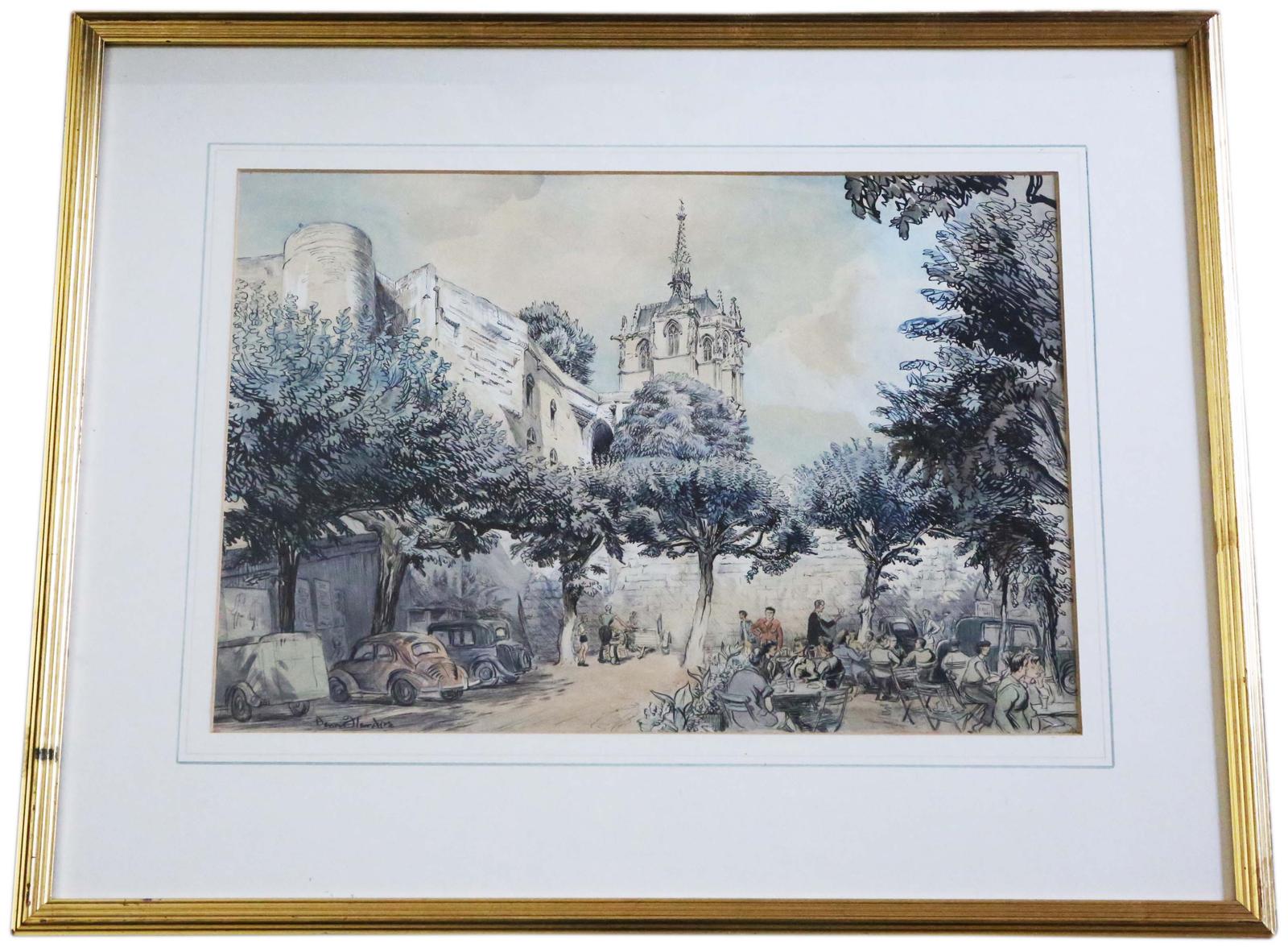 Large Pen & Wash Painting Artwork by Dennis Flanders of VW Beetle c.1950
