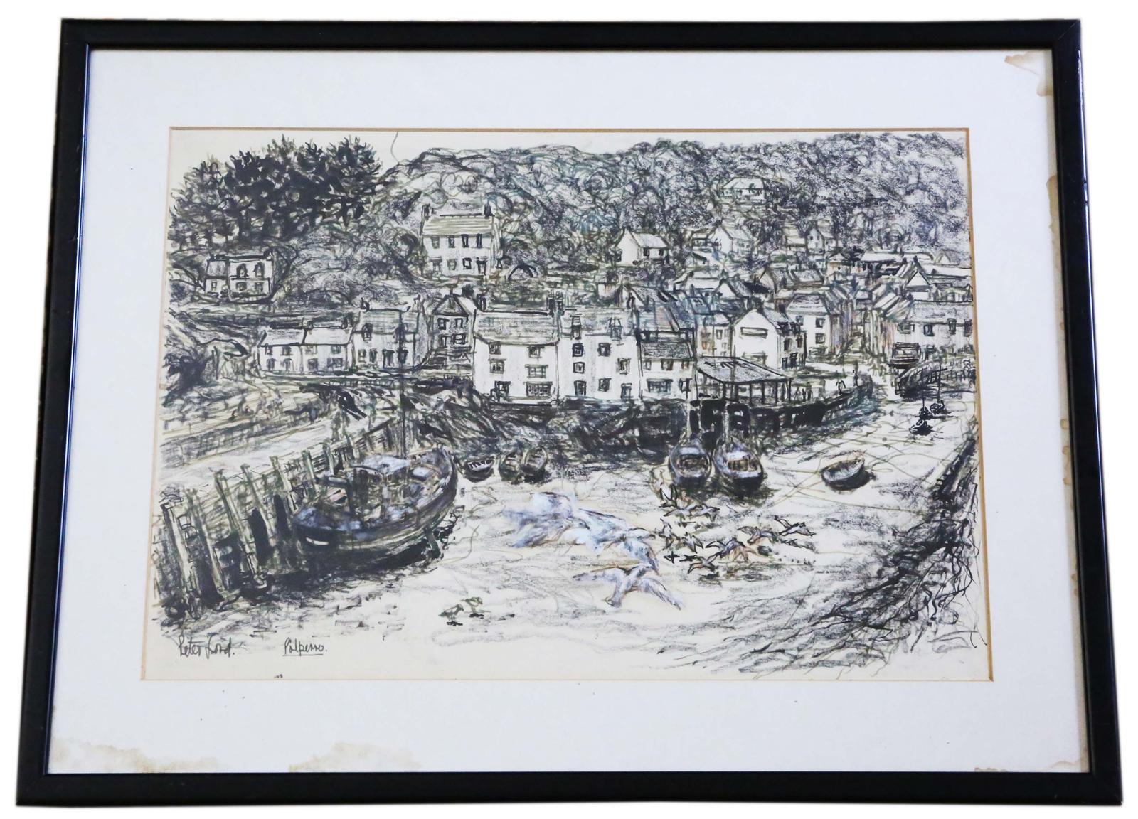 Large Pen & Wash Painting Artwork Polperro Harbour by Peter Ford c.1960