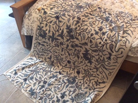 Large Piece of French Hand Made Crewel Work, Cover, Textile, Spread, Throw Violet Blue on White 3m x 2m