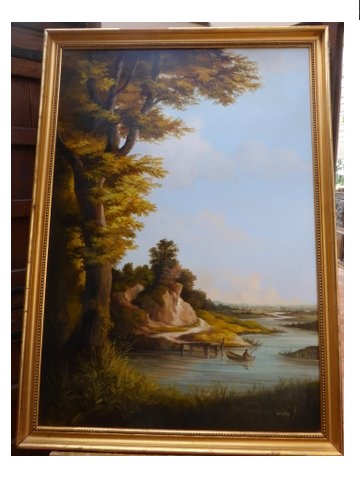 LARGE RIVER LANDSCAPE OIL PAINTING BY BERNARD PAGE IN THE 19THC MANNER 42 X 30 INCHES (1 of 1)