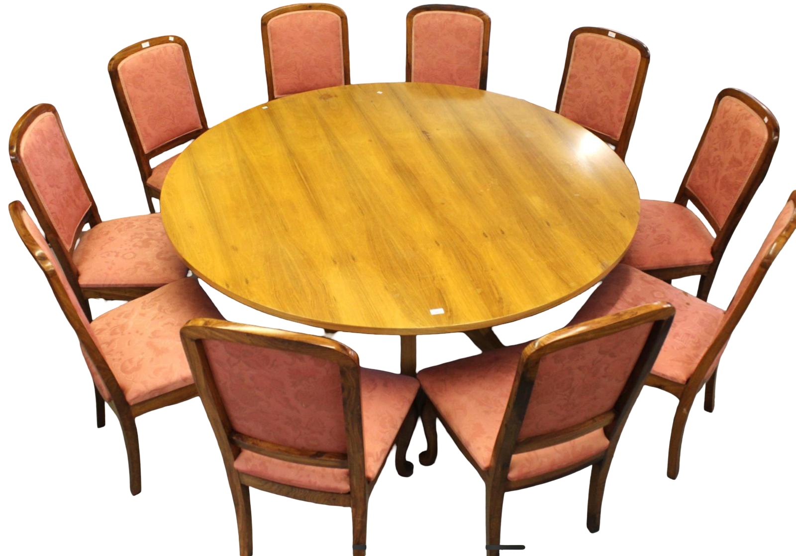 A very Large late 20th Century hardwood circular table and ten chairs in good original condition. Excellent value for money and a rare find being 184cm diameter.