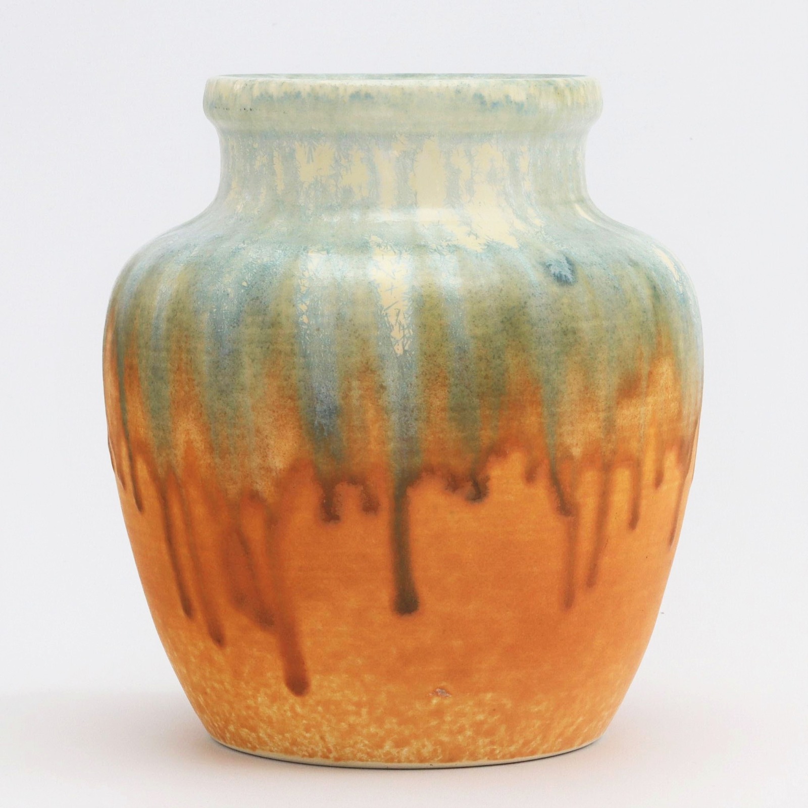 Large Ruskin Pottery Crystalline Drip Glaze Celadon-Blue & Orange Vase c.1930