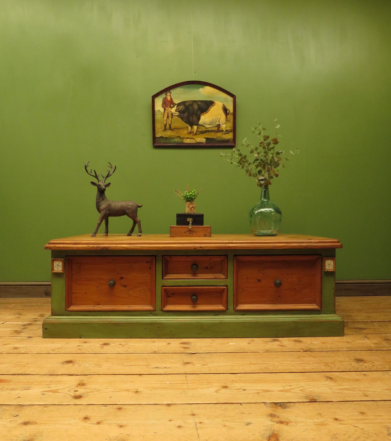 Large Rustic Green Painted Pine Coffee Table with Drawers