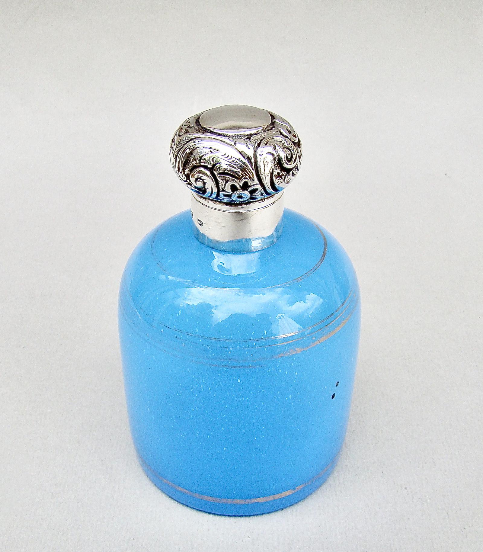 Large Silver Mounted Turquoise Opaline Glass Scent Bottle, Birmingham 1891