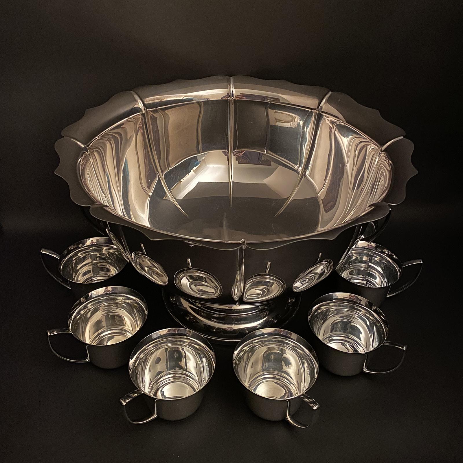 Large Silver Plate Punch Bowl & Cups