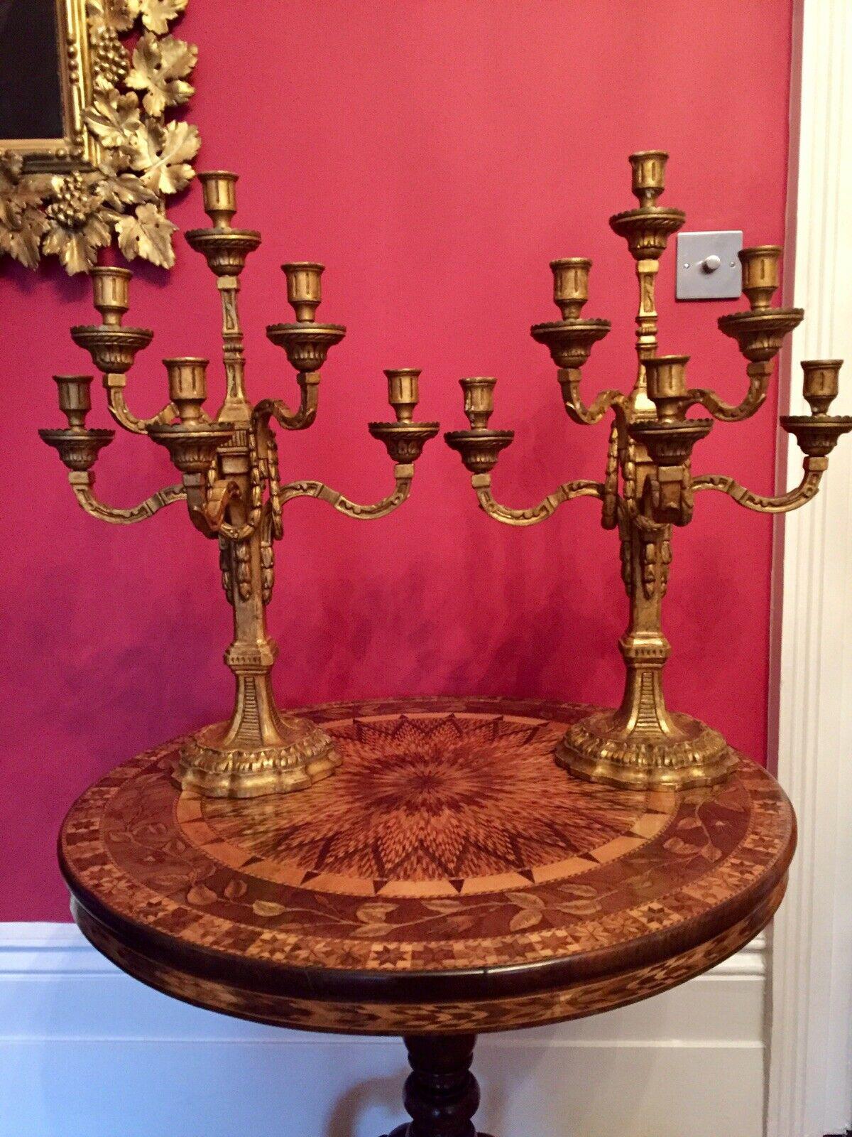 Large Splendid Pair of Antique Giltwood Candelabra, 6 Branch, Continental