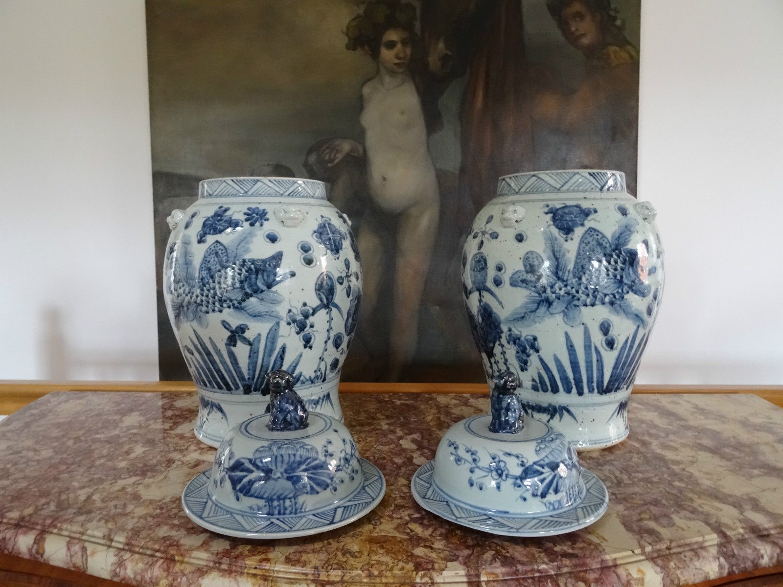 Large Stunning Pair of Dog of Foe Chinese Oriental Blue & White Vases c.1940