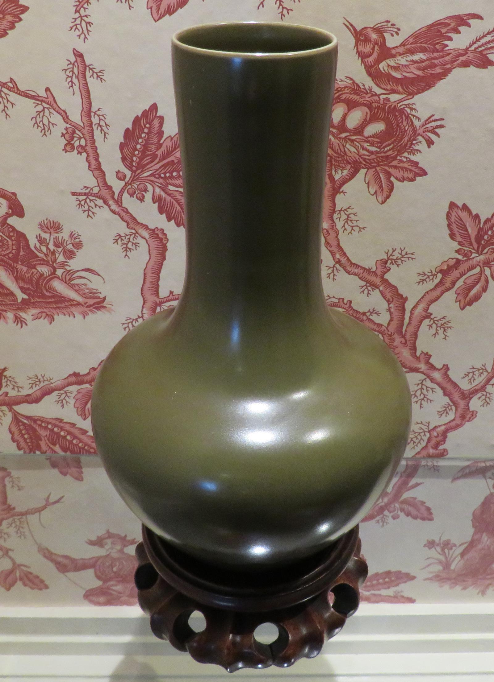 Large Tea Dust Chinese Vase & Wooden Stand 6 Character Mark