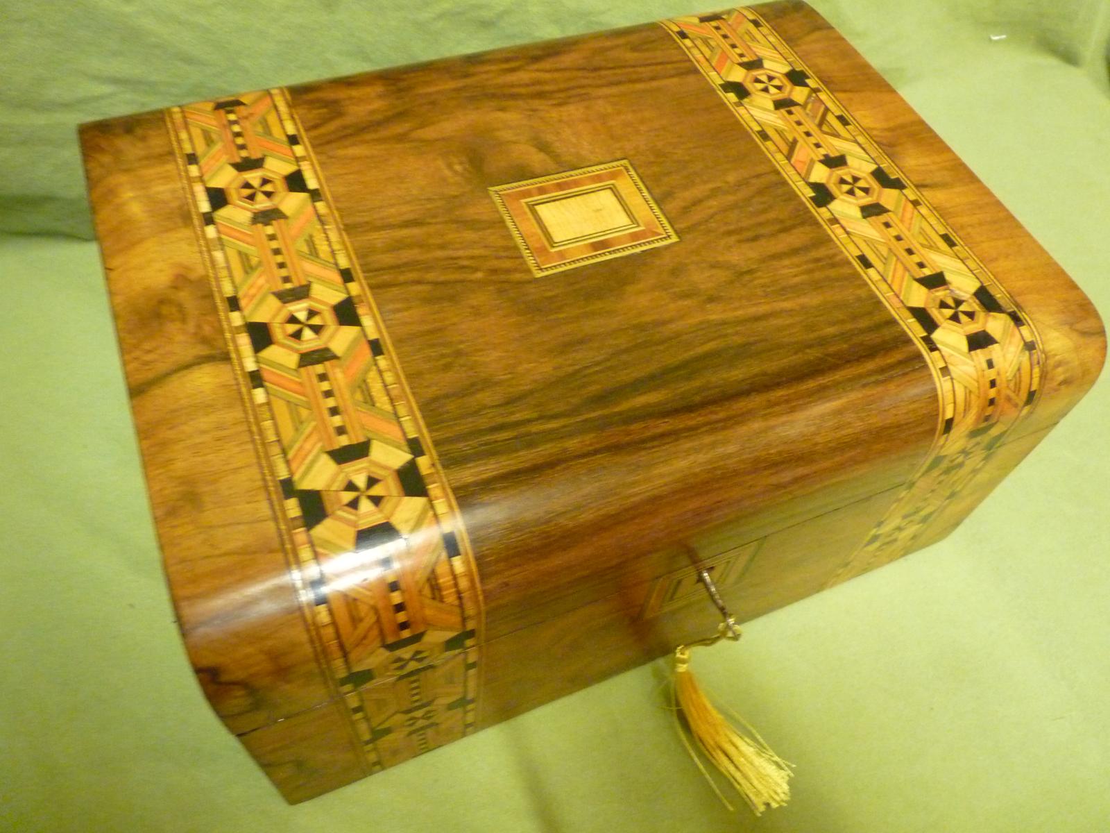 Large Tunbridge Style Inlaid Jewellery – Work Box + Original Tray c.1880