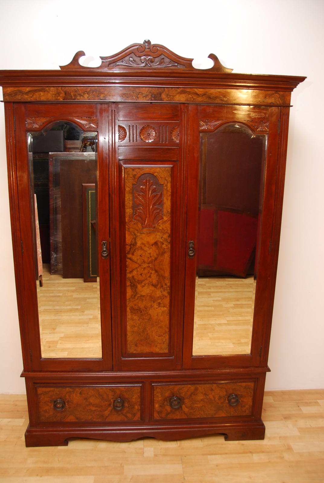 Large Victorian Antique Carved Walnut Burr Walnut Triple Compactum Wardrobe