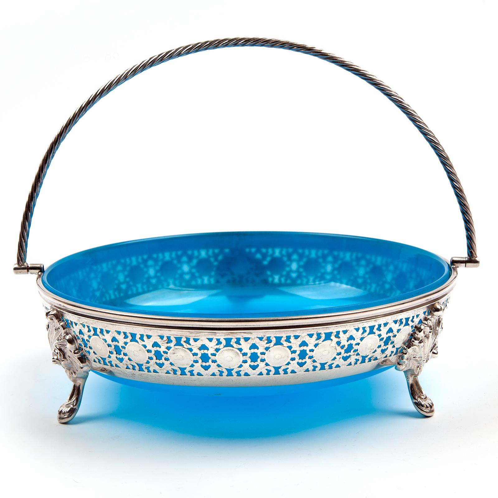 Large Victorian Circular Blue Opeline Glass Lined Silver Plated Basket