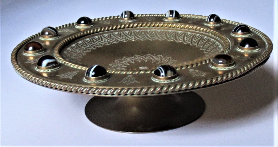 Large Victorian Gilt Bronze Tazza with Agate Bull's Eye Cabochons in the Manner of Pugin c.1875