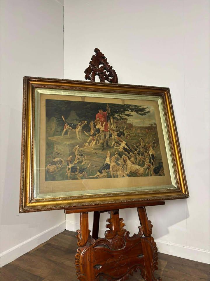 An impressive and decorative Victorian hunting scene, richly presented within an ornately moulded gilt and gesso frame of excellent scale and presence. A striking piece of traditional sporting art, full of movement and narrative, depicting a huntsman surrounded by hounds in a lively countryside setting.