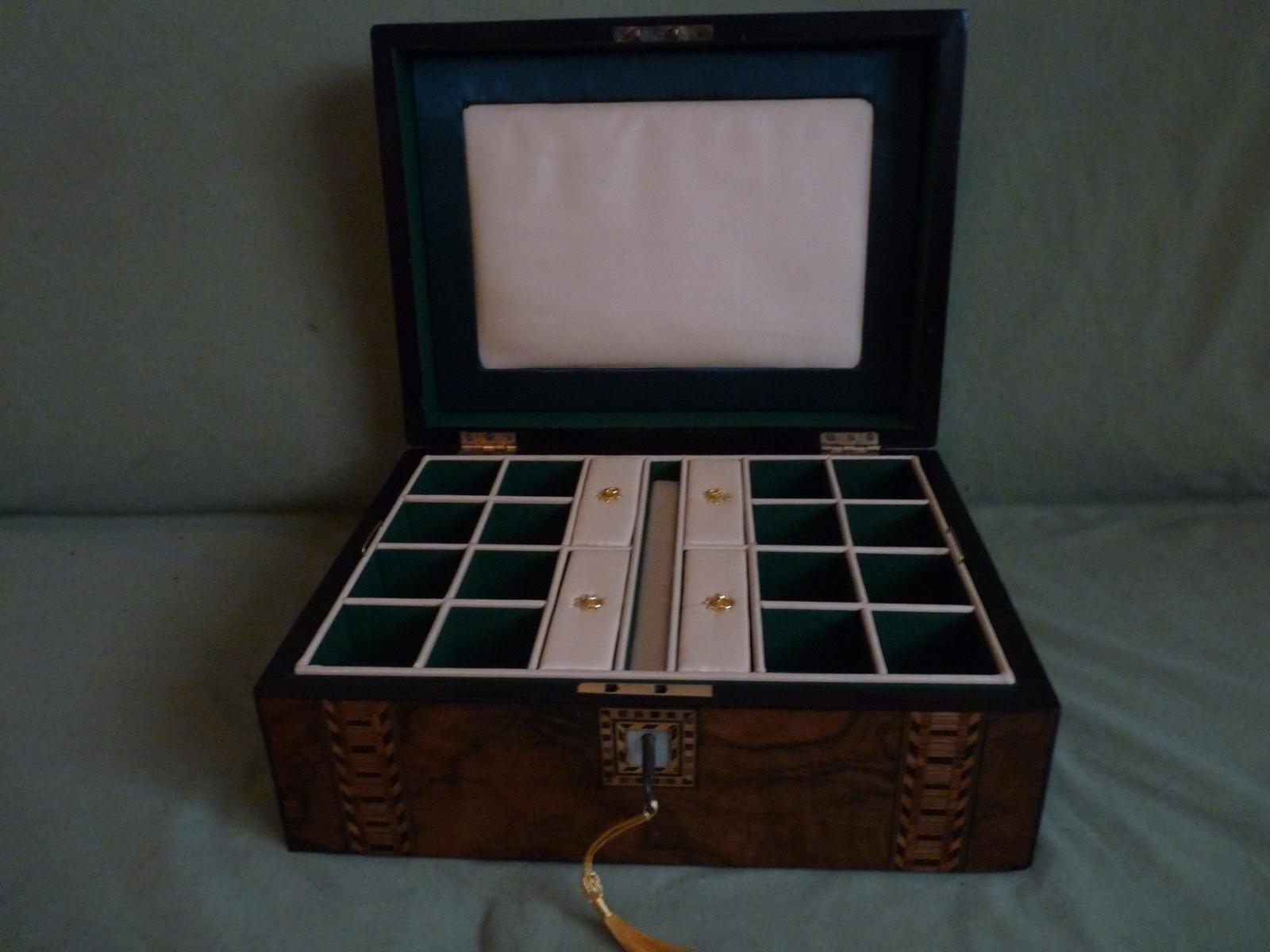 Large Victorian Inlaid Burr Walnut Jewellery Box + Tray. C1880