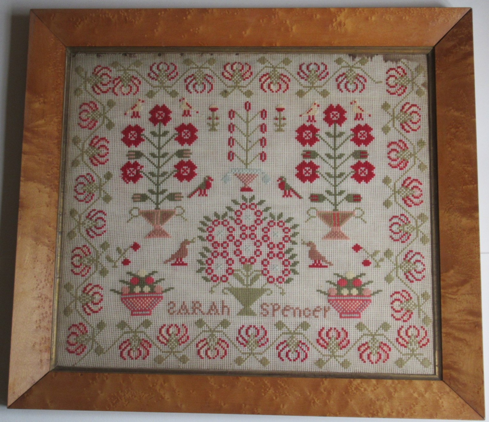 Large Victorian Linen Sampler, Sarah Spencer, c.1840 in Period Frame
