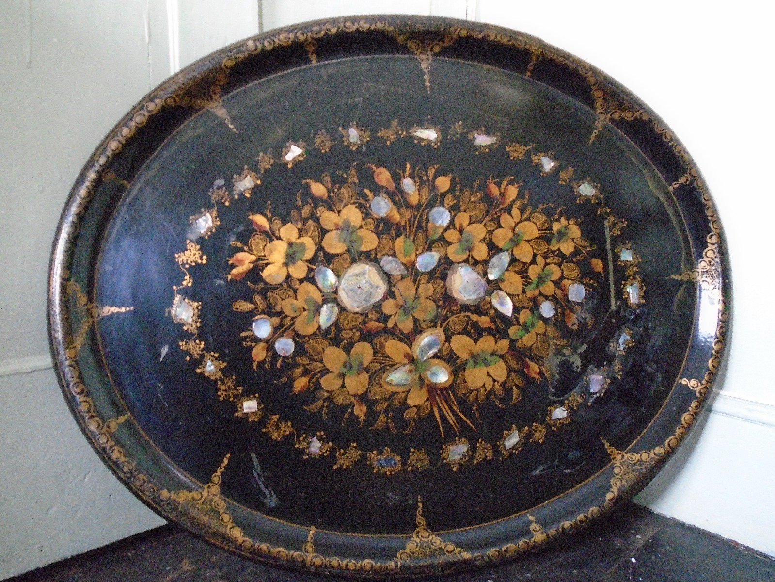 Large Victorian Papier Mache Tray with Floral Gilt & Mother of Pearl Decoration