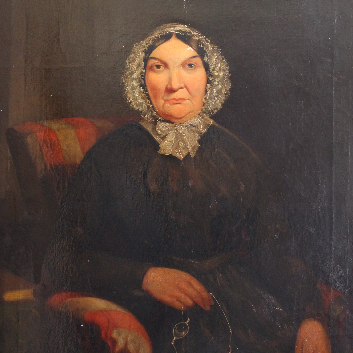 Large Victorian Portrait of a Lady Holding Glasses, Original Antique Oil Painting
