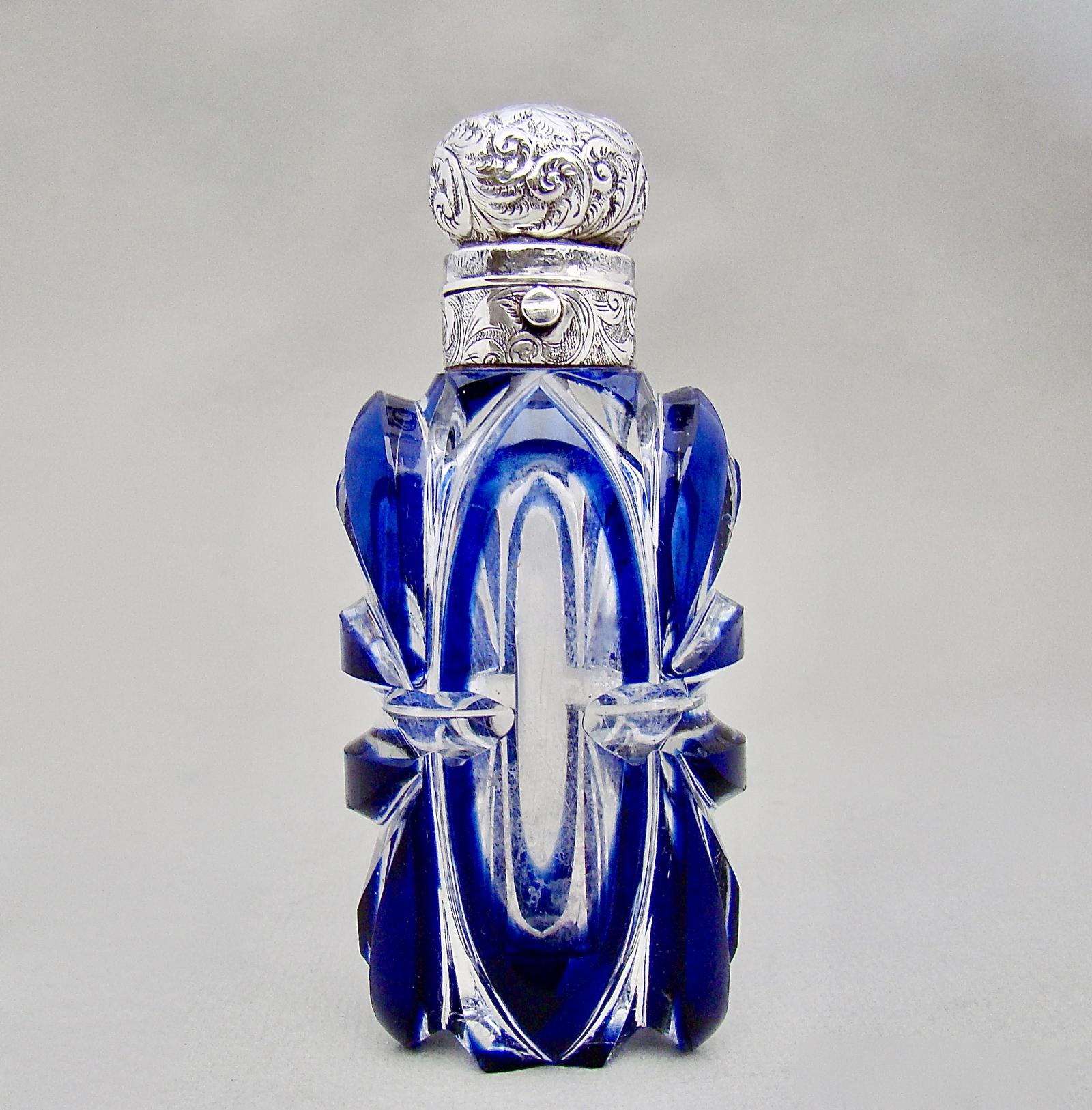 Large Victorian Silver & Bristol Blue Overlay Bohemian Glass Scent Bottle c.1880