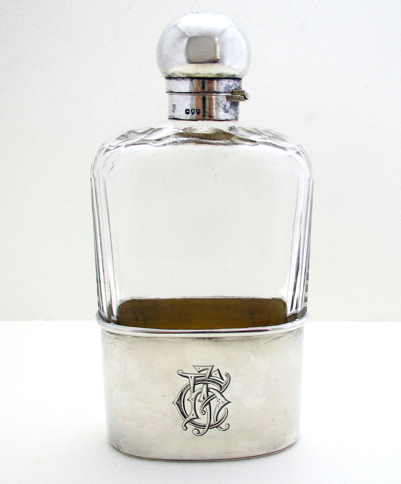 Large Victorian Solid Sterling Silver & Cut Glass English Antique Spirit Whisky Hip Flask Bottle Container 1890