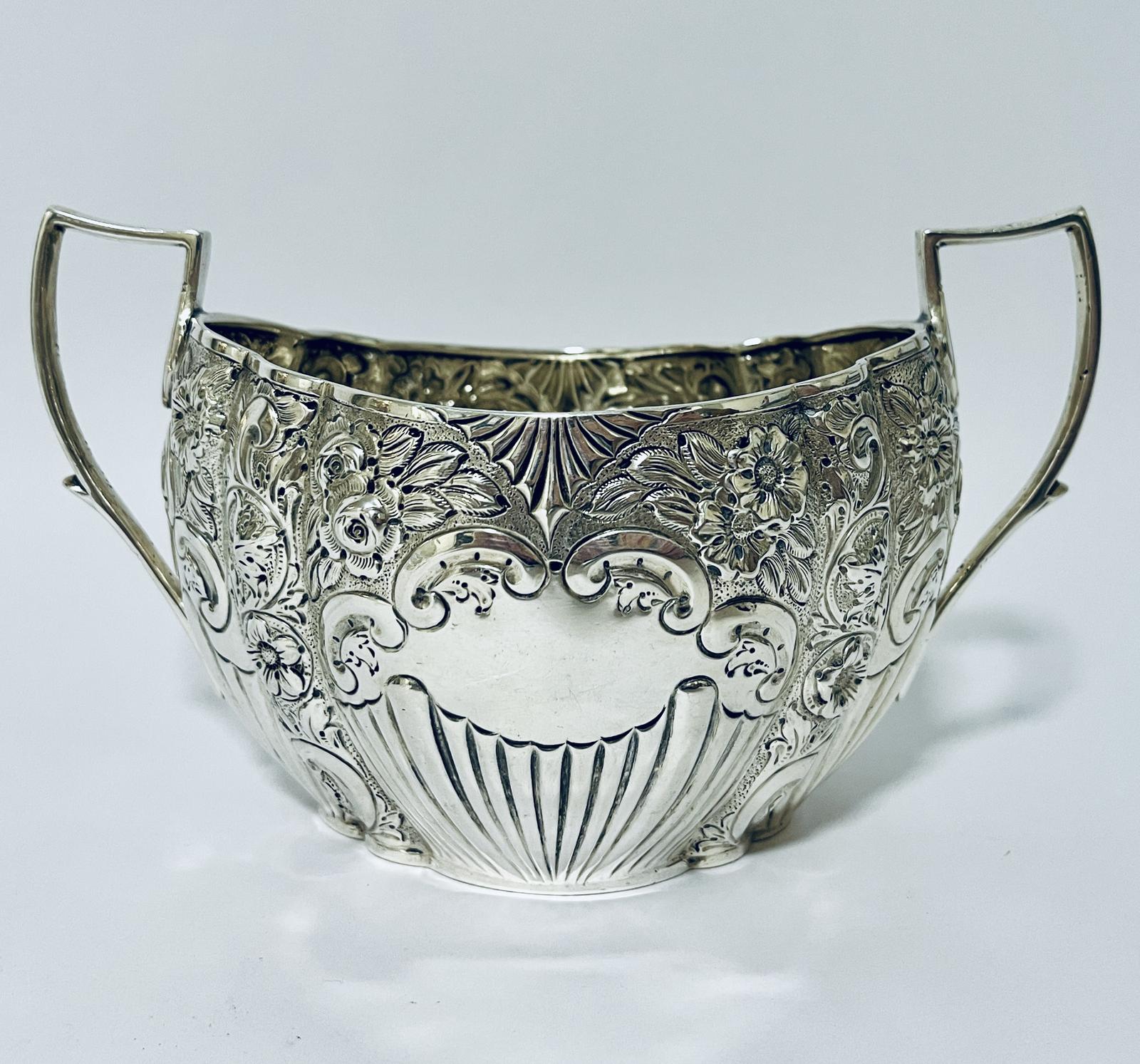 A good example of a large antique sterling silver sugar bowl with two handles. It is decorated with beautiful repousse foliate decoration and two vacant cartouches and gadrooned detail. The bowl is stylish and good quality, weighing approximately 303g. It is clearly hallmarked for London, 1897 and the maker W&C Sissons. The best description comes from the photos so please look at them all carefully and if you have any questions just ask.