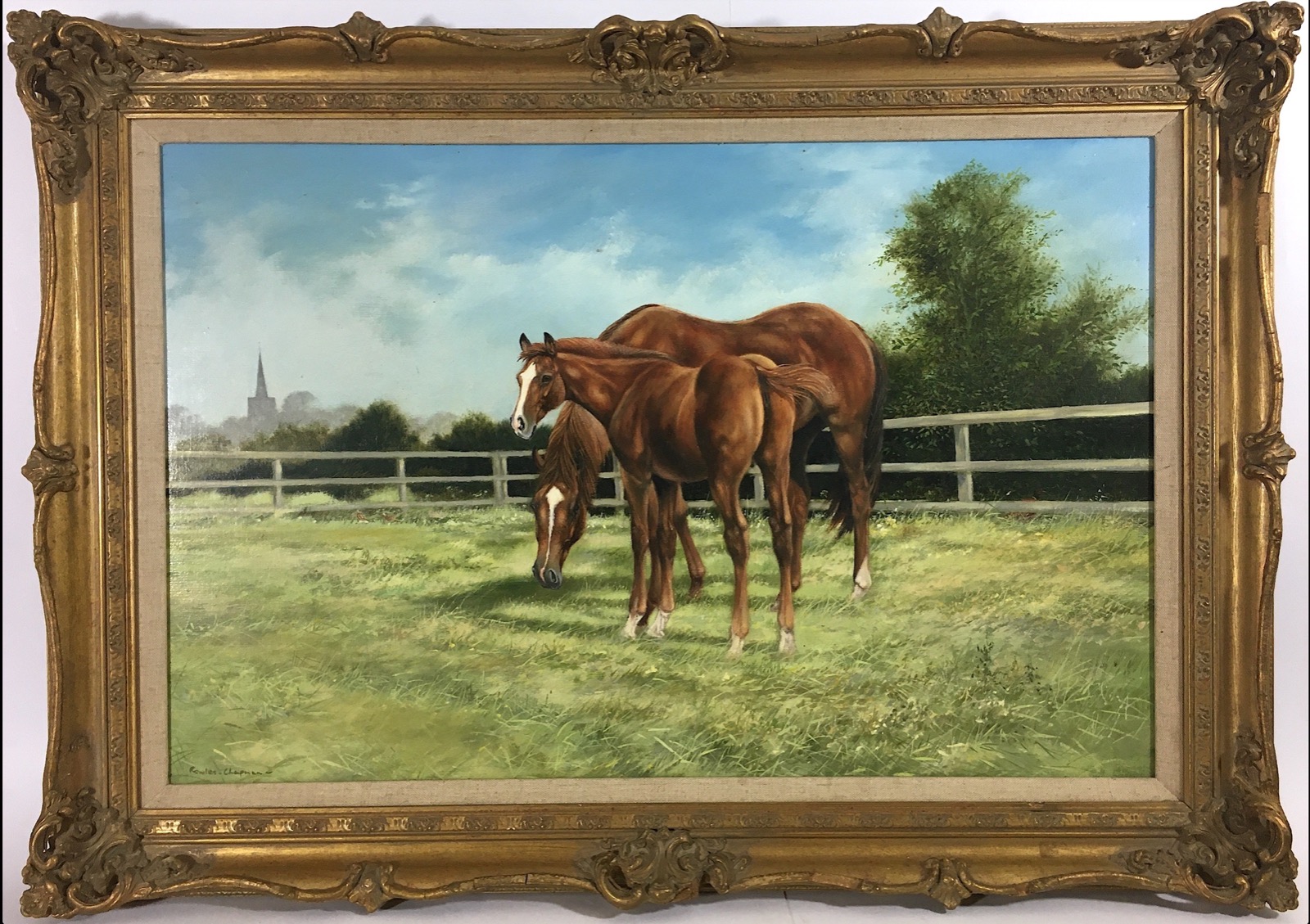 Large Vintage Equestrian Landscape Oil Painting of Horses Swept Gilt Frame (1 of 6)