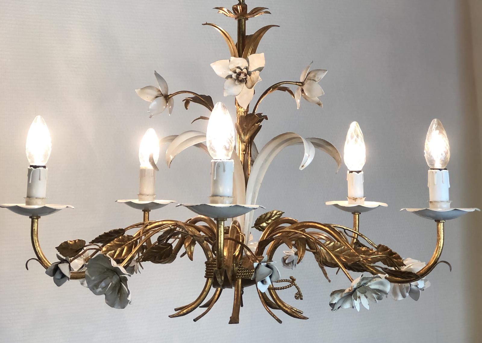 Large Vintage French 5 Arm Gilt Toleware Chandelier