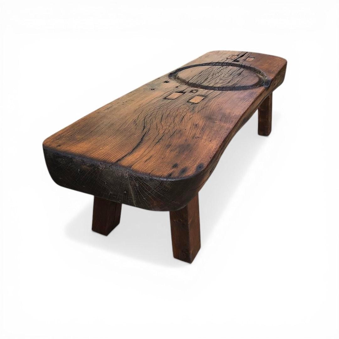 Very heavy chunky rustic oak vintage coffee table made in the 1920s probably, though possibly later, likely eastern european. This was probably once a boar slaughtering table, if that doesn't put you off your macchiato..there's a roughly hewn groove with an exit slot for draining away the terrible fluids (like herbal tea, blood etc). Having sanded this extensively, we can report no horrid lingering smells, and there isn't really any staining so it might actually have been for another purpose. There were holes cut in the top for a framework but these have been filled in since. A really thick top, all in one piece of timber, with four splayed legs which can be removed with a bit of jiggling. We could glue and screw the legs in but, once it's sitting in place, there's no real movement as the legs are also good and thick. We've coated the whole thing with finishing oil, enough to give it some water resistance. Further coats will provide more protection but things get shiny.