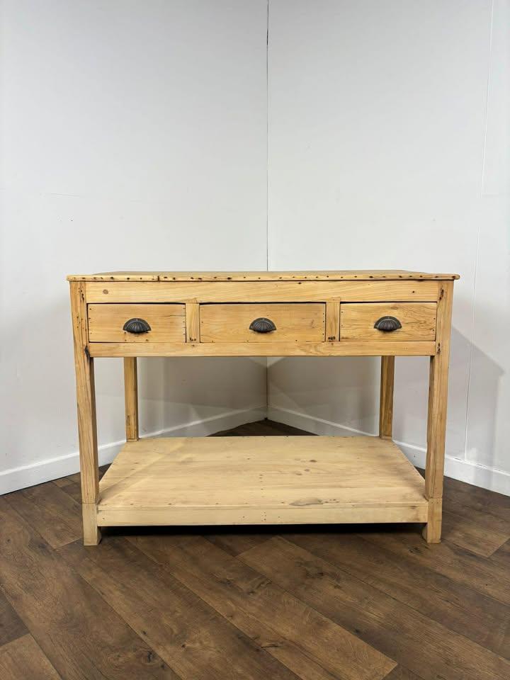 Solid, sturdy and full of rustic character, this versatile piece works wonderfully as a kitchen island, console table, potting table, or shop display unit, and would complement farmhouse, country, or industrial style interiors.