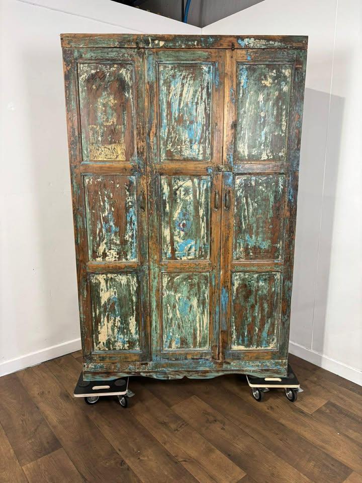 A stunning vintage Indian triple door cupboard featuring a beautifully distressed blue painted finish with layers of aged colour and natural wood showing through, creating a wonderfully authentic rustic appearance. The rich mix of blues, greens and warm timber tones gives this piece exceptional character and visual appeal.