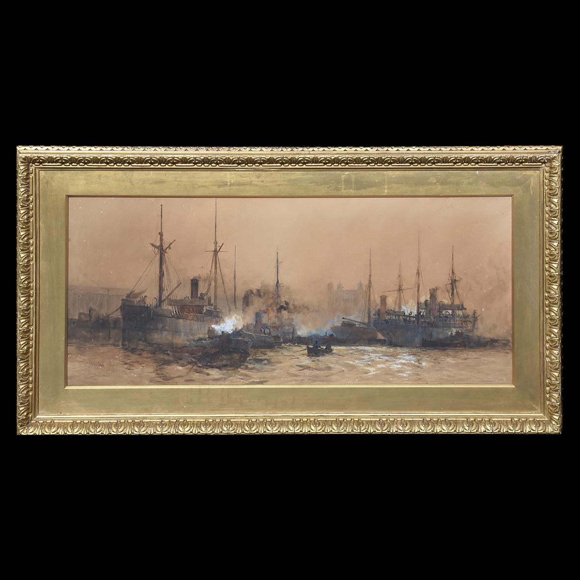 Large Watercolour Painting by Charles Edward Dickson of Shipping in a River