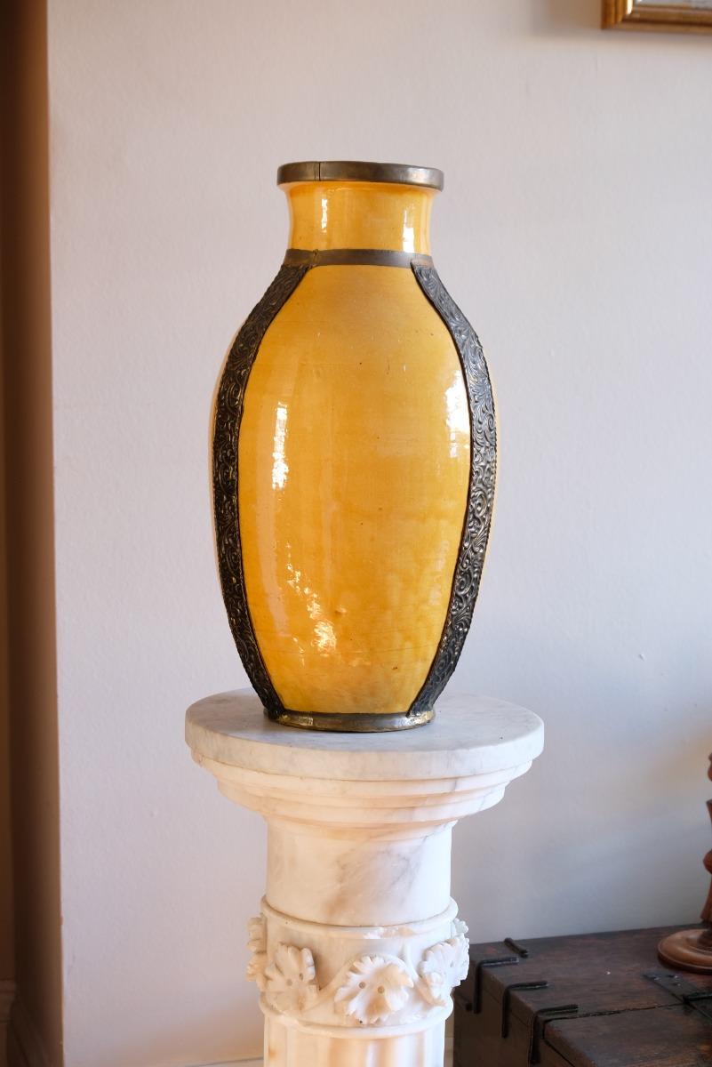 Large Yellow Ground Baluster Vase with Ornate Metal Banding