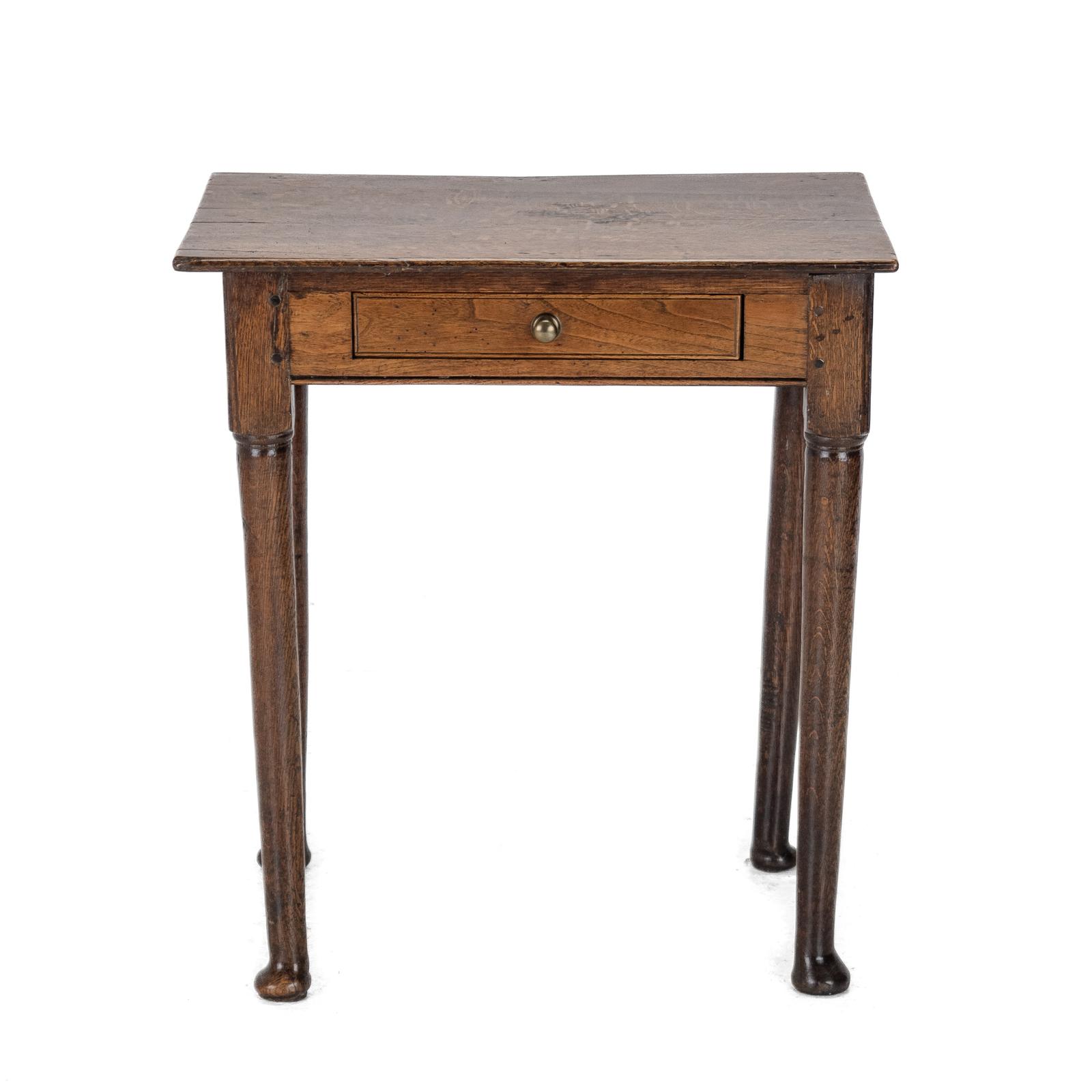 There are marks, blemishes, and natural age-related splits to the top consistent with long use. The associated oak top is of comparable period and character, and the later drawer is a sympathetic addition, formed using original frieze material. The table retains a pleasing warm patina and attractive colour, enhanced by a traditional wax finish, and is ready for immediate use.