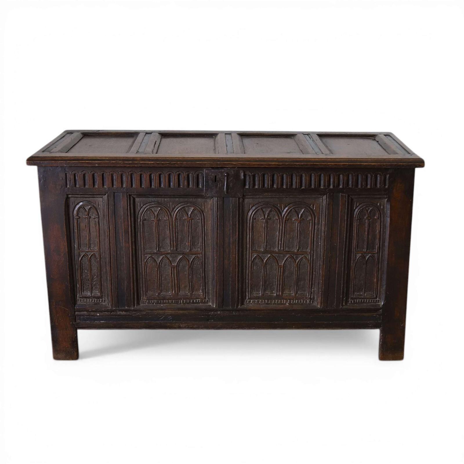 Late‑17th‑century Cornish ecclesiastical oak coffer with Gothic carved panels, untouched surface and strong regional character - Rare, atmospheric and deeply authentic