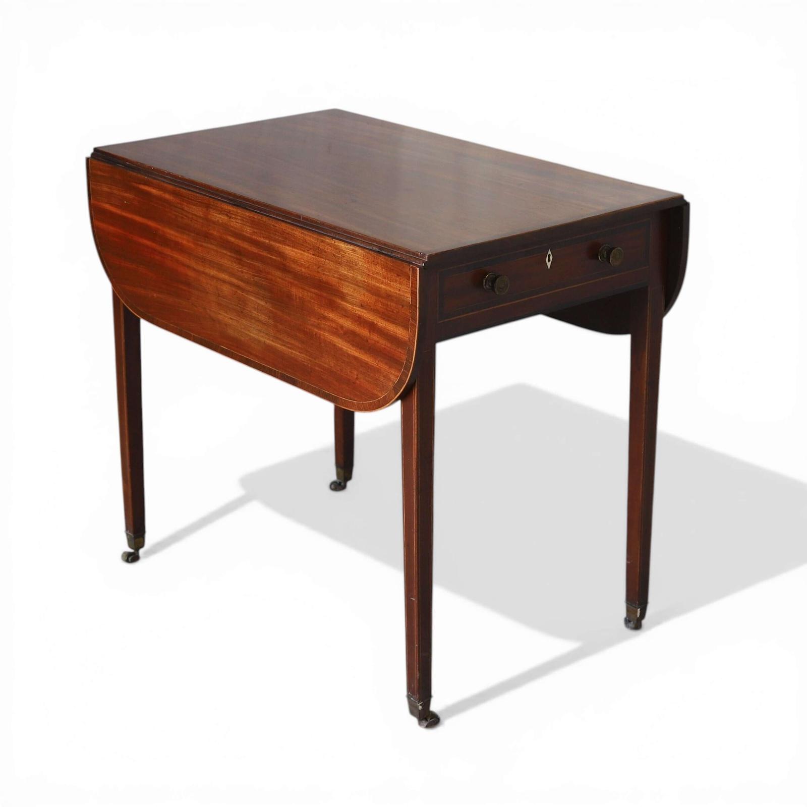 The Pembroke table emerged in the mid‑18th century as a refined, space‑efficient design featuring two hinged leaves supported by brackets or swing legs. Its name is traditionally linked to the Countess of Pembroke, who popularised the form within fashionable Georgian interiors. This example reflects the influence of Thomas Sheraton (1751–1806), one of the great English furniture designers of the period. Sheraton championed: