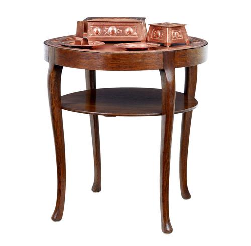 Late 19th century arts and crafts copper tray table with collection circa 1890. Unusual arts and crafts oak copper tray table with a collection of 4 matching copper pieces. Matching pieces consisting of 2 hinged boxes, a dish holder and small dish, all in the same manner as the removable tray which sits in the table base. Circular table with a further shelf supported between the 4 cabriole legs. Minor expected surface marks
