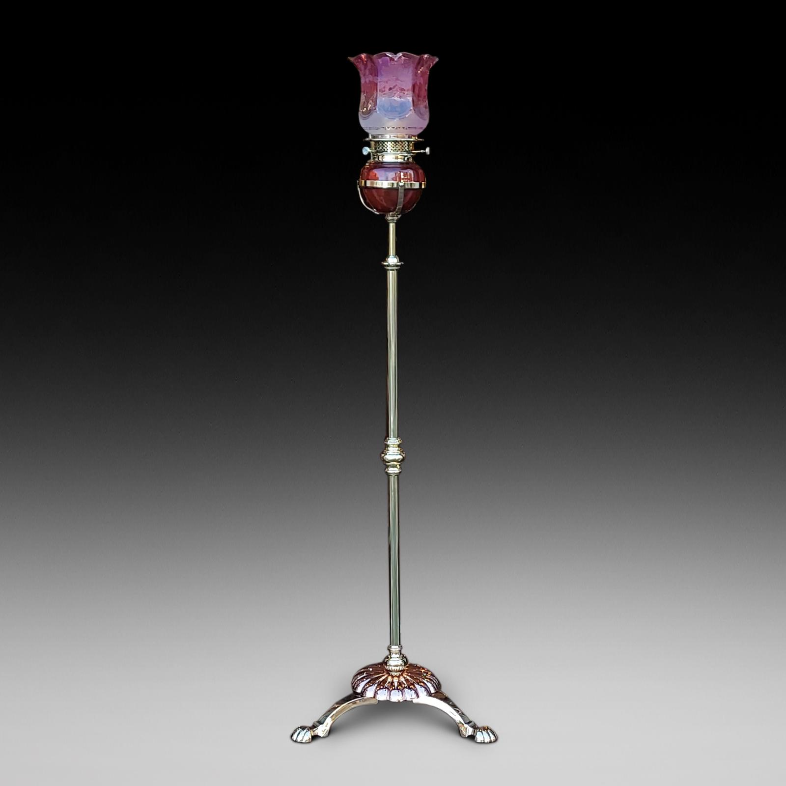 Late 19th Century Brass & Copper Floor Standing Cranberry Glass Oil Lamp