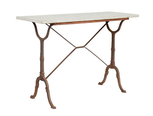 Elegant late 19th Century (c.1890) antique cast iron side table ideal for use as a sofa, side, hall or lamp table. Ornate base which has taken on a stable rusted appearance with decorative stretcher. Each standing on a small pad foot. Pine top hand painted to simulate stone. Minor age splits to top but structurally sound and ready for everyday use.