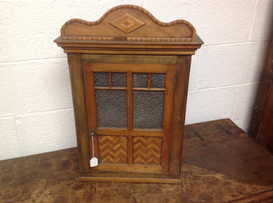 Late 19th Century French Child's Walnut & Cherry Wood Apprentice Piece Armoire / Small Cabinet with Frosted Glass Andy Chevron Inlay