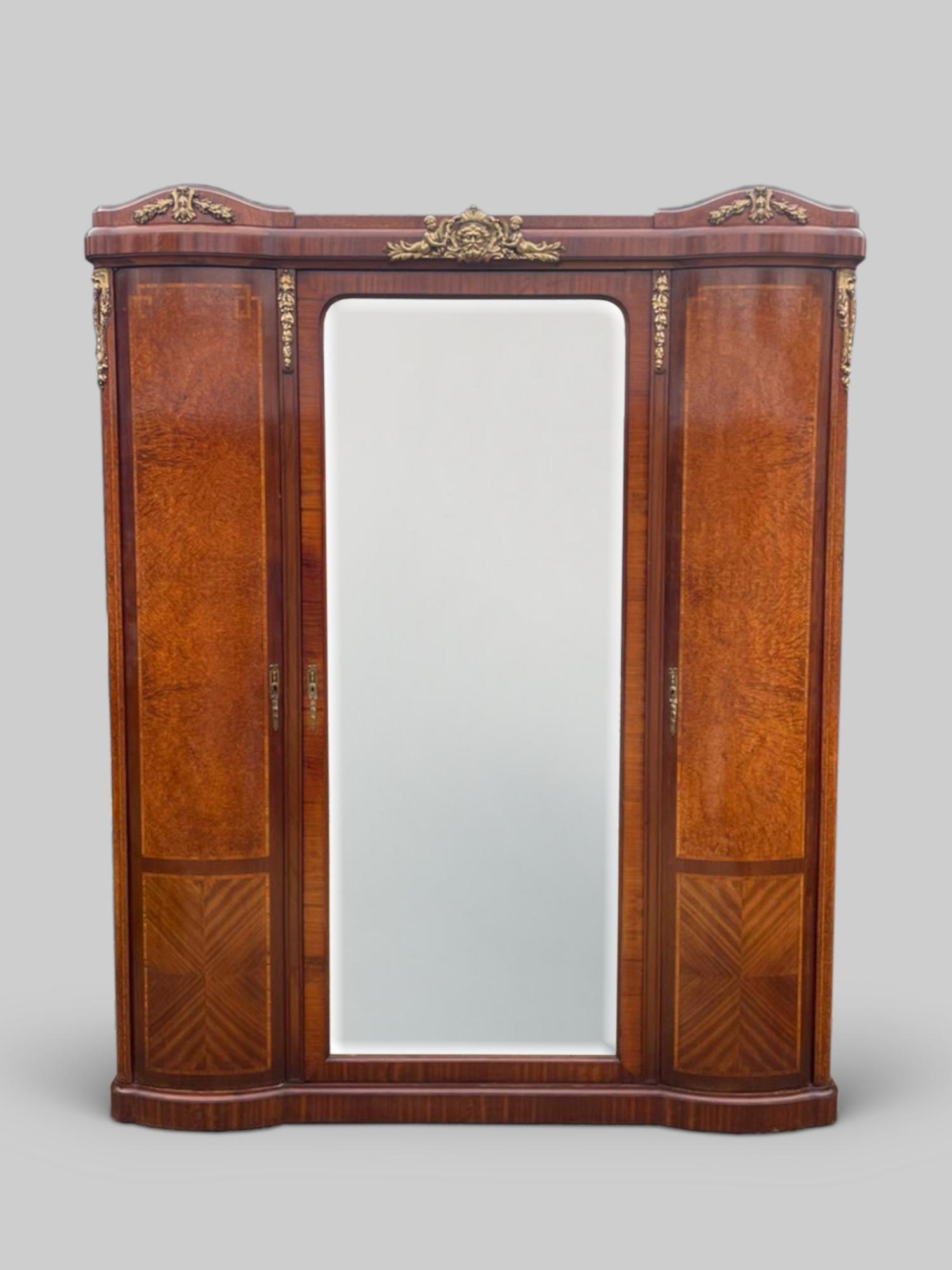 A superb French 19th‑century wardrobe showcasing the refined craftsmanship and decorative elegance of the Louis Philippe / Second Empire period. This impressive piece is constructed from solid mahogany and walnut, admired for their rich tone and enduring quality, and features beautifully patterned veneer panels that enhance its visual depth. There is a central mirrored door framed by finely carved mouldings, ornate crest and decorative carvings, highlighted with subtle gilt accents. Inside are adjustable shelving, ideal for flexible storage and a full‑length hanging rail perfect for hanging garments. Its combination of decorative artistry and practical storage makes it a standout addition for collectors, designers, and lovers of fine antique furniture.