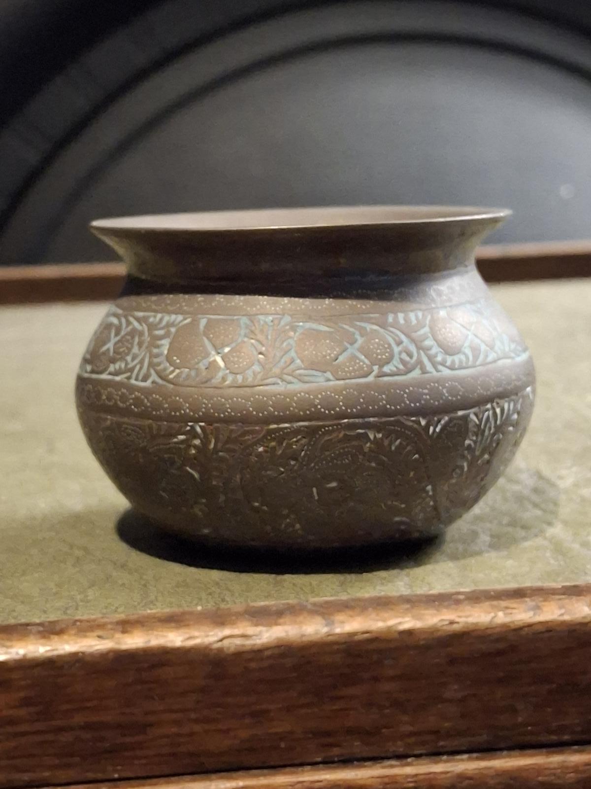 This item is a late 19th century Indo-Persian small engraved copper pot, created between 1880 and 1900. The pot features intricate engravings typical of the period and region. It is made of copper, reflecting traditional metalworking techniques and I believe it to be a small holy water pot the base is marked 192 and it's in lovely condition it stands.