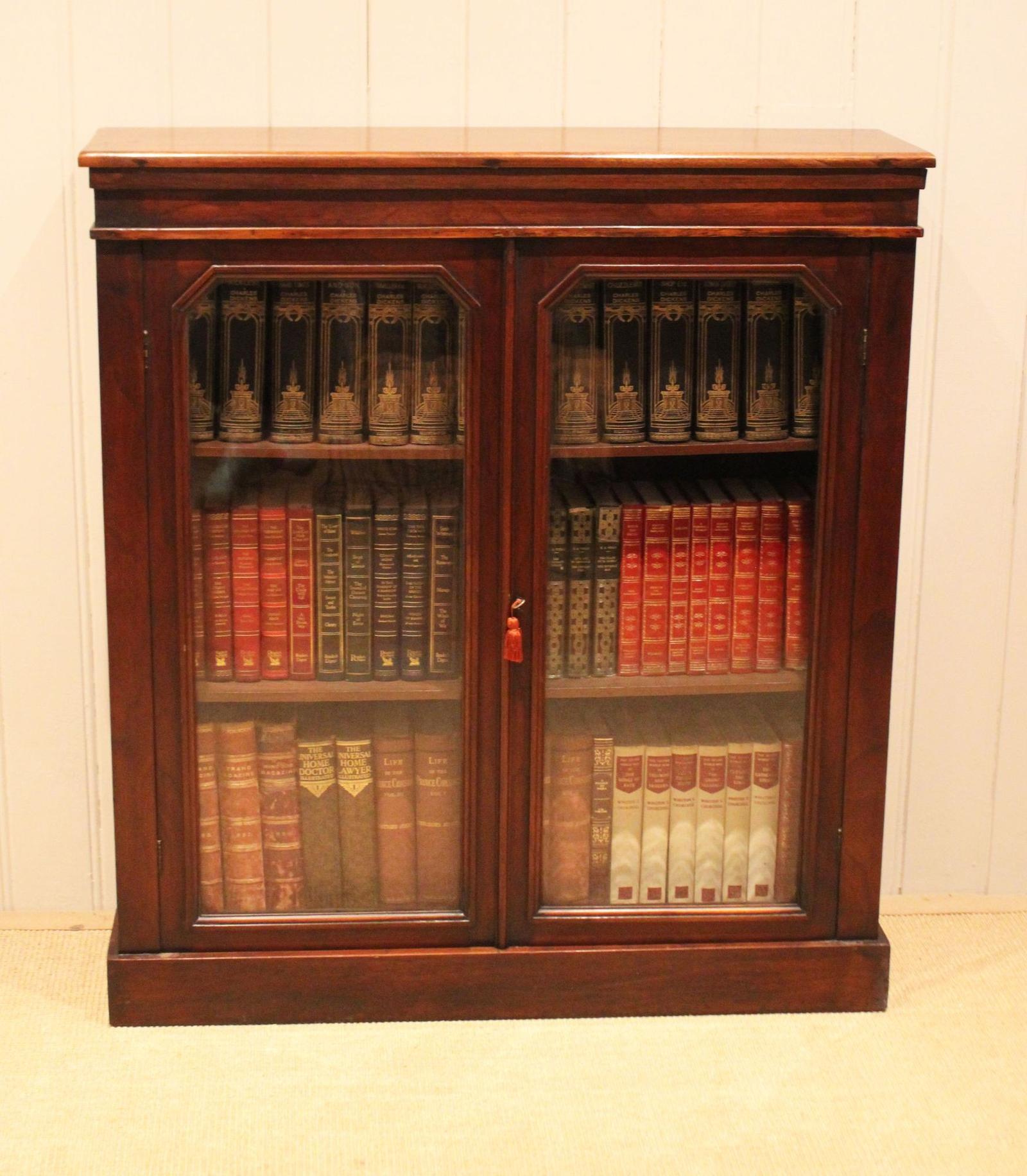 Late 19th Century antique mahogany bookcase having a pair of glazed doors opening to reveal two adjustable shelves, raised on a plinth base, complete with working lock and key.