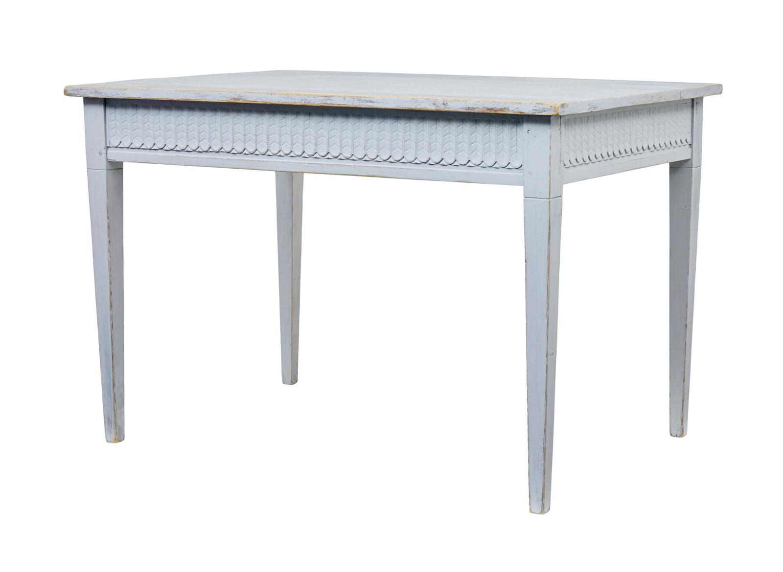Late 19th century painted pine swedish table circa 1890. Good quality multi purpose table which could also function as a desk. Pine top surface which over-sails the hand carved apron which runs around the front and sides. standing on 3 tapering legs. later painted into a light grey/blue colour. Some surface marks and wood knots to top surface, areas of where the paint has begun to wear through. minor restorations to strengthen leg joins.