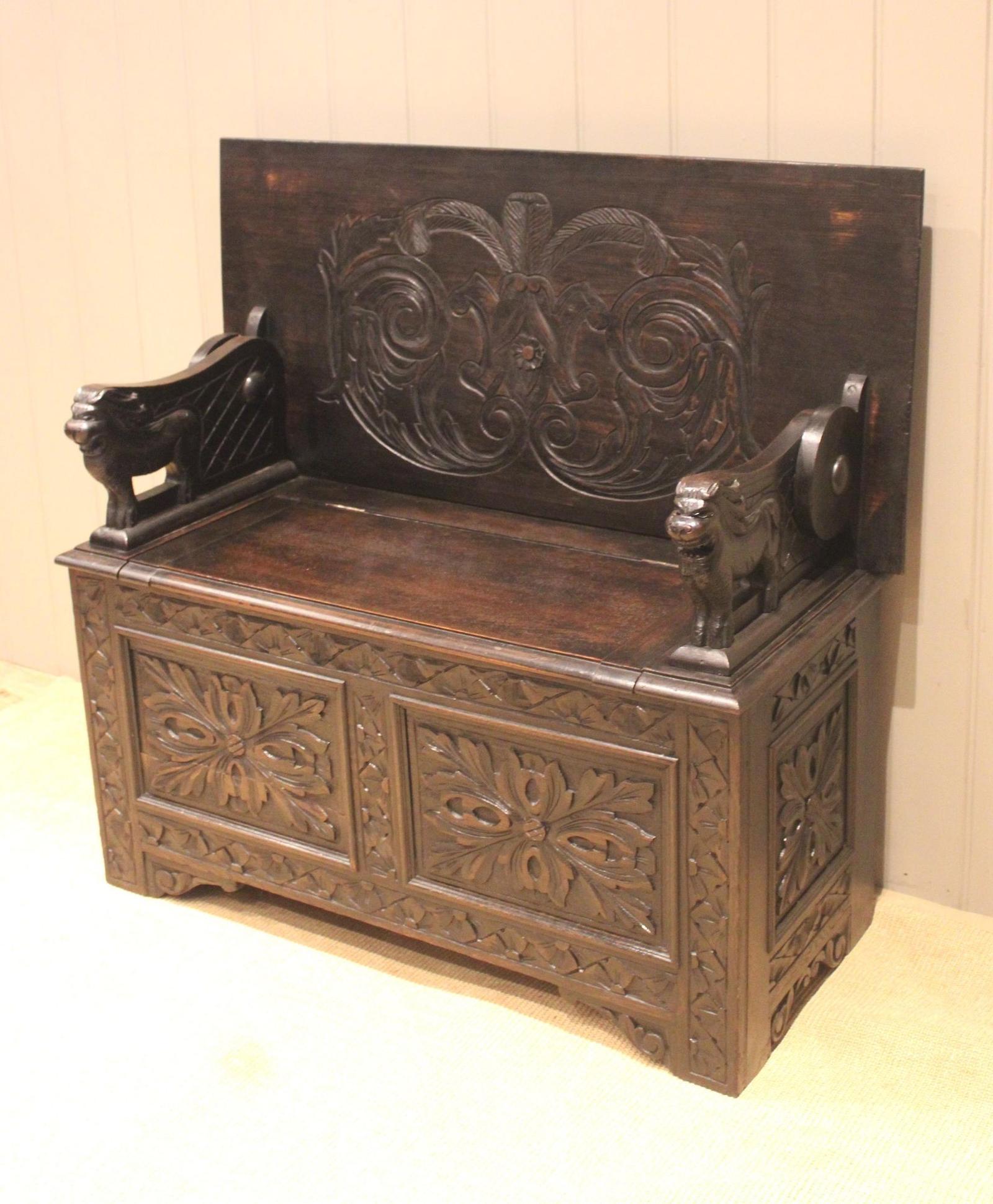 Late Victorian Carved Oak Monks Bench (1 of 13)