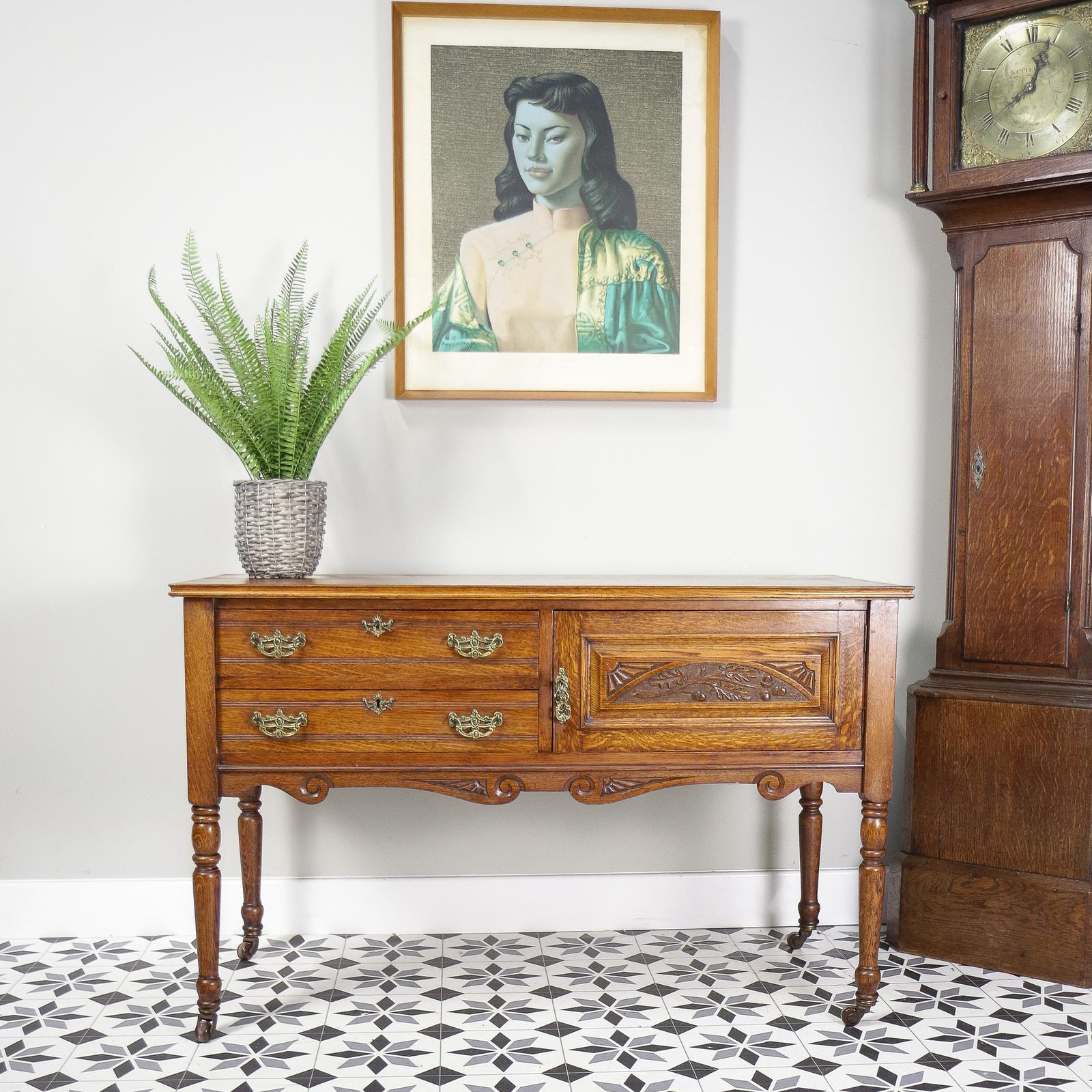 Late Victorian / Edwardian Oak Side Cabinet with Carved Panel