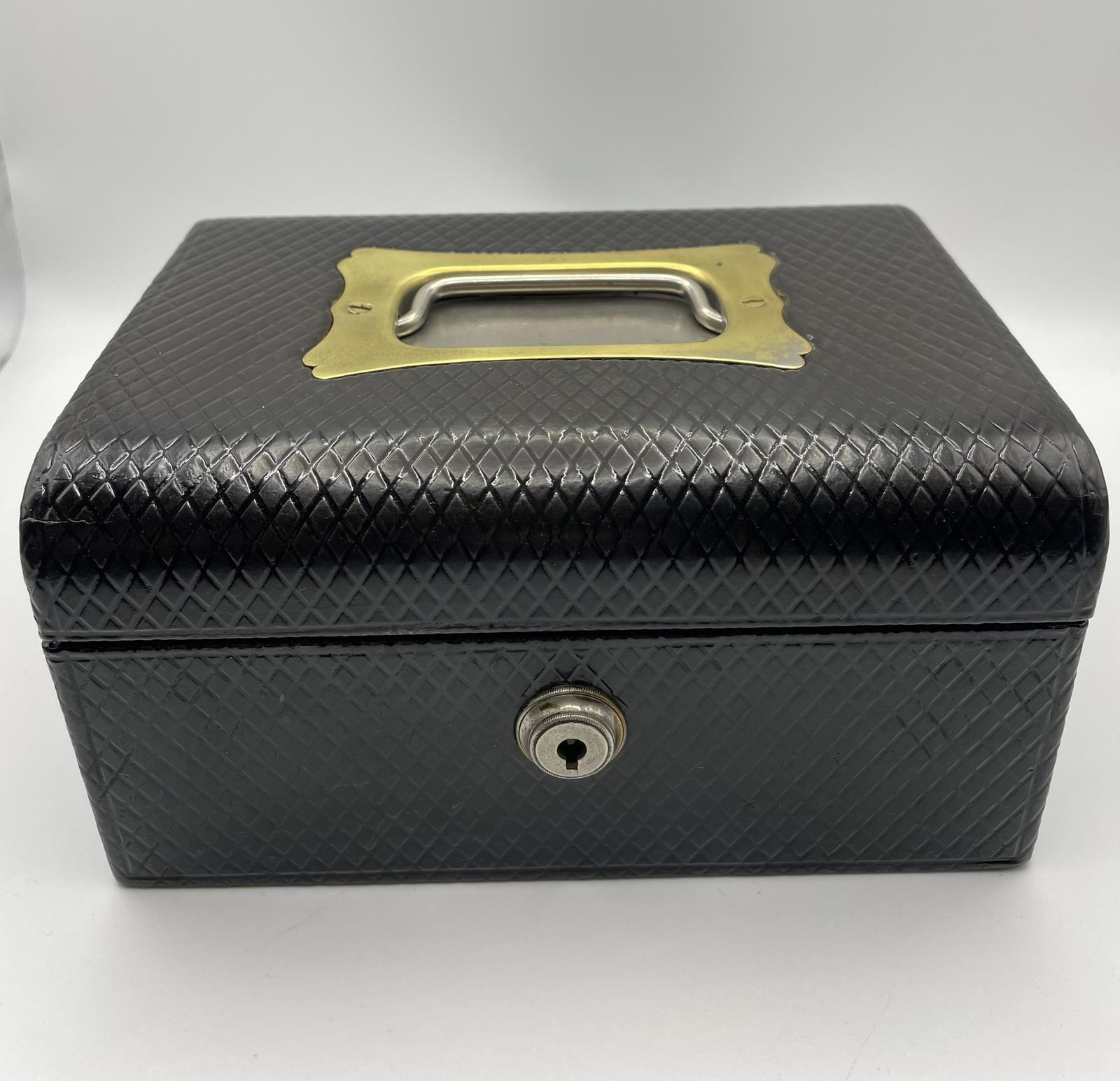 A late Victorian jewellery box covered in black leather with a green silk interior. Working Bramah lock with key.